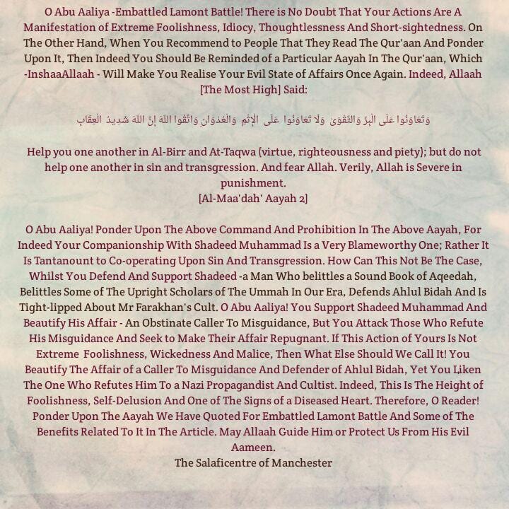 Either way such an individual is not to be trusted–he deliberately lies, plots, conspires and works with half-truth and fallacies. He has deliberately lied and slandered to suit his own goals! So if he does that with this affair then what about all the rest of his accusations!? We cannot take anything from this man when he has now proven himself an unjust irrational liar and a fanatical defender of an innovator and haddaadi (Yahyah al Hajoori).