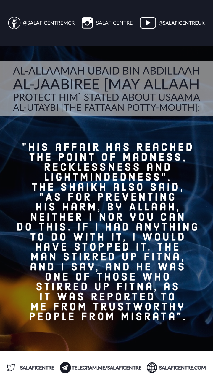 In The Name of Allaah, The Most Merciful, The Bestower of Mercy. Why do we refer to him as a “Pottymouth Hater?” That is because he uses obscene language, hurls false accusations at people in both religious and worldly affairs, and even accuses them of immoral conduct with women without a shred of evidence. This … Continue reading [1] Usaama Al-Utaybi- [The Pottymouth Vile Hater Whose Affair Has Reached The Point of Madness….]