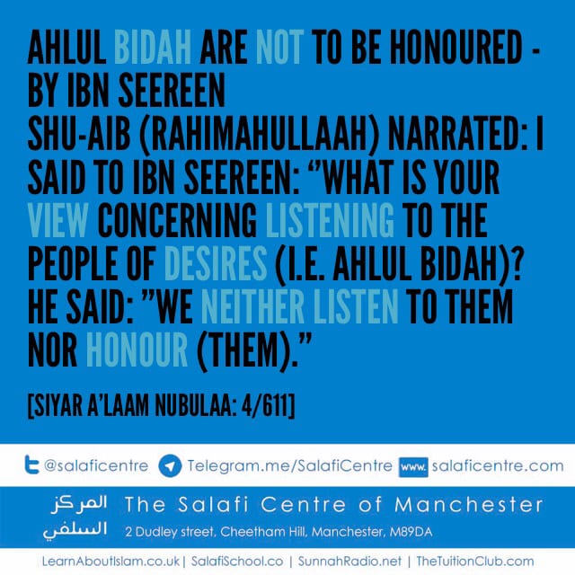 “O Muslims! Fear Allah, accept the advice of the sincere advisers and the admonition of the admonishers. know that this knowledge is religion, so beware of what you do, from whom you take your religion, the one you follow, and the one with whom your religion is safe because indeed all the proponents of religious innovation are falsifiers, liars, and sinners. They are not cautious – neither do they pay attention nor do they fear, and together with that they are not to be trusted that they would not distort what you hear. They say what they do not know with regards to what they disapprove of and when proclaiming their lies; but Allah (knows, hears, and sees) what they do. Therefore, be cautious of them, trust them not, reject them, and avoid them because this is what your earlier scholars did and commanded, and likewise the righteous ones who came thereafter. Be careful of opposing Allah and being the means to destroying the religion He has ordained – breaking its commands and prohibitions, nullifying and weakening it by respecting the innovators in religious affairs and those who initiate that which is not from the religion because you know what has been transmitted (i.e. the prohibitions) about respecting or exalting them. What can be greater respect and exaltation than acquiring your religion from them- following and believing them, drawing close to them, and assisting them in enticing the ones they entice and wooing to their views and the religion (i.e. religious innovations) they follow? This is sufficient to be regarded as associates of theirs in what they do“. [1]