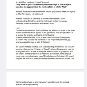 Second, Abu Makkah should focus on one of those very matters that a seeker of knowledge must always keep in mind, rather than futilely attempting to demonstrate if Shaikh Abu Khadeejah has been given Tawfeeq in the path of knowledge. Imaam Muhammad Ibn Saalih Al-Uthaymeen [may Allaah have mercy upon him] said: If one asks, “How can sincerity in the pursuit of knowledge be (attained)?” We say: Sincerity in seeking knowledge can be attained by making an intention for the following: