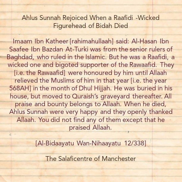On the authority of Ya’qoob ibn Yusuf al-Mutdawi’ who said “‘Abdulrahman ibn Saalih al-Azdi who was a Raafidi and he used to visit Imam Ahmed, and he (Imam Ahmed) would bring him closer to himself so it was said,  “O Aba ‘Abdillah, ‘Abdulrahman ibn Saalih al-Azdi is a Raafidi?!  So Imam Ahmed said, “subhanallaah, he is a man who loved the family of the Prophet, shall we say to him don’t love him! He is thiqa (trustworthy in narrating).”